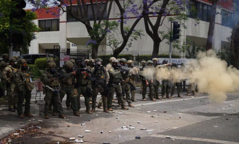 ماموران با کلاه ایمنی و باتوم، با تشکیل صف و قدم زدن آهسته در خیابان، معترضان را از ساختمان دور کردند.