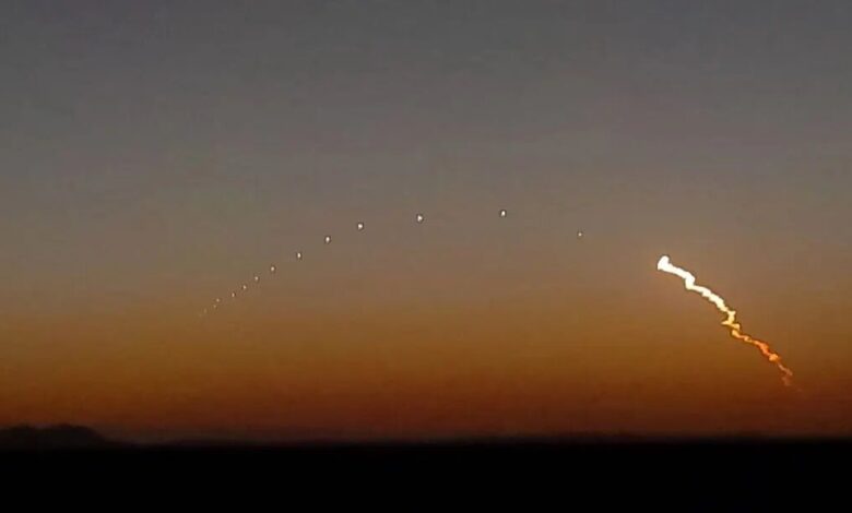پدیده گرگ و میش (Twilight Phenomenon): این پدیده بصری خیرهکننده که اغلب با اجرام ناشناس فضایی یا انفجار اشتباه گرفته میشود، در پرتابهایی که هنگام غروب یا طلوع آفتاب انجام میشوند، رخ میدهد. در این حالت، ناظر روی زمین در تاریکی قرار دارد، اما موشک به ارتفاعی رسیده است که ستون گازهای خروجی آن مستقیماً توسط نور خورشید روشن میشود. ابر در حال انبساط گازهای خروجی و بلورهای یخ مانند یک پرده نمایش غولپیکر عمل کرده و با پراکنده کردن نور خورشید، یک شکل نورانی، وسیع و اغلب مارپیچی یا مثلثی ایجاد میکند که از فواصل بسیار دور قابل مشاهده است. شکل مارپیچی میتواند ناشی از چرخش مرحله بالایی موشک یا تخلیه سوخت اضافی باشد.