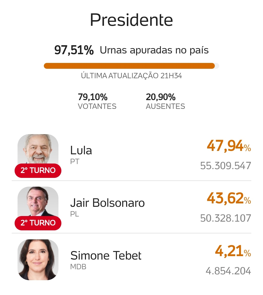به گزارش بامداد دوشنبه صدای جامعه به نقل از رسانه های بین المللی ، «ایناسیو لولا داسیلوا» سیاستمدار کهنه کار ۷۶ ساله برزیل و رئیس جمهوری پیشین این کشور با کسب ۴۷.۹ درصد آرا (حدود ۵۵.۵ میلیون رای) و ژائیر بولسونارو رئیس جمهوری فعلی این کشور باکسب ۴۳.۷ درصد آرا (حدود ۵۰.۵ میلیون رای) در حساس ترین و سرنوشت ساز ترین انتخابات ریاست جمهوری برزیل در سه دهه اخیر، در رقابتی شانه به شانه، موفق به کسب حدنصاب لازم برای پیروزی در دور نخست نشدند و دور دوم انتخابات با رقابت این دو نامزد کمتر از یک ماه دیگر برگزار خواهد شد.